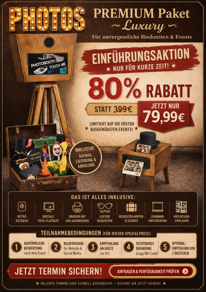 Dann sichere dir jetzt unsere hochwertige Retro-Fotobox im Premium-Design – zum einmaligen Einführungspreis. Dieses Mega-Angebot ist insgesamt nur 5 Mal erhältlich!