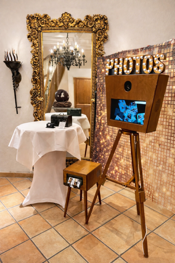 Eine Retro-Fotobox fügt sich hier besonders harmonisch ein – sie wirkt wie ein charmantes Detail aus einer anderen Zeit und wird schnell zum Lieblingsplatz eurer Gäste.